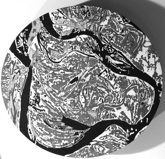 The centrally located exhibits of the 2nd floor showcase works by Parvathi Nayar, Romicon Revola, Ashu Gupta and Saju Kunhan. Parvathi’s exhibit explores water in its simultaneous ubiquity and scarcity, portrayed through the entire spectrum of perspective – from bird’s eye to microscopic. Romicon showcases two video projects and a central sculpture: the former meditates on a single drop of water and the latter engages with the phenomenon of the urban sprawl, while the sculpture attempts to address them both. Ashu, the festival’s youngest artist, attempts to reconcile her despair about Bangalore’s lost trees through a series of pen and ink drawings on canvas. The bridge features the largest work of the festival: a 30’ by 8’ oil on canvas by Saju Kunhan that, despite being created in 2011, has never been previously exhibited due to a lack of a large enough exhibition space. Inspired by Saju’s first experience of a “mega city” – Mumbai – the detail and scale of the work is mesmerising and should not be missed.