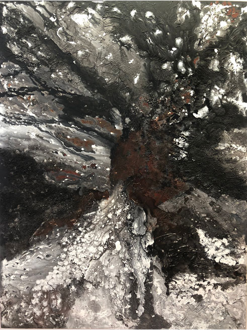 The 2018 edition of Art Bengaluru brings together 17 Indian artists across 24 exhibits to UB City. The festival begins at the foyer with two stainless steel sculpture exhibits by pre-eminent artist Balan Nambiar. A master with over 60 years of experience, Mr. Nambiar’s forms dance elegantly between symmetry and asymmetry, and are often inspired by childhood memories and symbols associated with the ritual arts. He will also be showcasing a body of jewellery enameled paintings that have never been exhibited previously and a selection of mild steel sculptures on the ground floor and piazza respectively. Gurudas Shenoy’s natural and urban semi-abstract canvases appear next – with an extensive collection at Sublime Galleria on the 8th floor as well. Kavita Jaiswal subsequently contemplates existentialism and perception through abstraction via mixed media works on canvas across two exhibits at the luxury corridor entrance. Moving inwards, Vipta Kapadia’s ephemeral abstractions in oils juxtapose Chandan Bhowmick’s vivid terrestrial abstractions in acrylic opposite Louis Vuitton and Burberry. This section transitions into the next with large linear hillscapes in pen and ink on paper from 1986 by D Venkatapathy – the senior most living founder member of the Cholamandal Artist Village and an important member of the Madras Art Movement.
